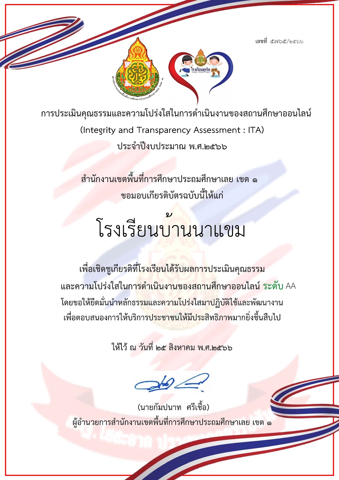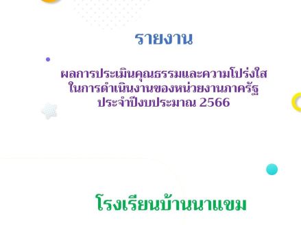 ผลการประเมินคุณธรรมและความโปร่งใสในการดำเนินงานของสถานศึกษาออนไลน์ (Integrity and Transparency Assessment Online: ITA Online) ประจำปีงบประมาณ พ.ศ.2566 ของ โรงเรียนบ้านนาแขม สรุปผลการประเมินภาพรวมได้ 98.08 ระดับคุณภาพ AA