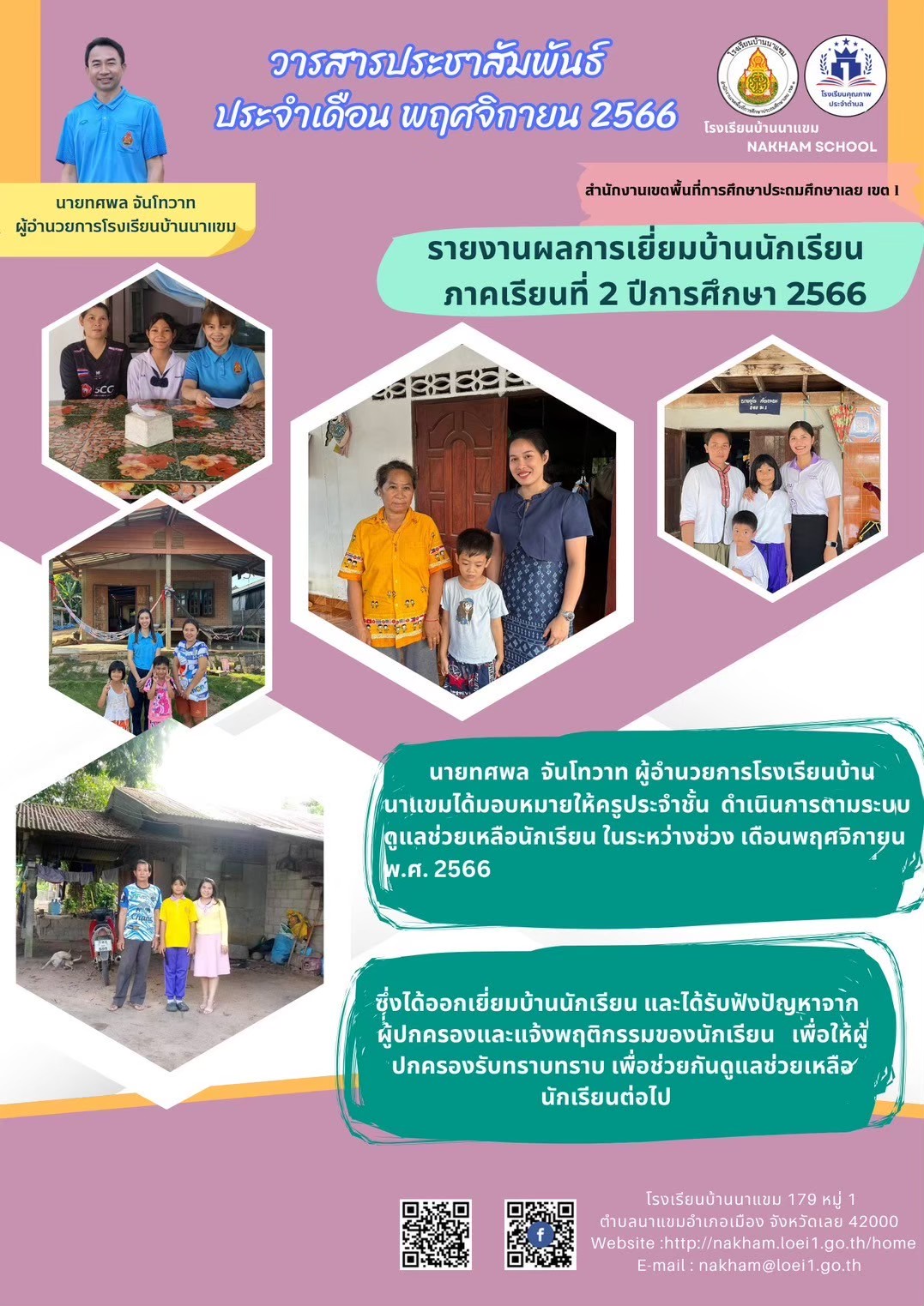 นายทศพล จันโทวาท ผู้อำนวยการโรงเรียนบ้านนาแขมได้มอบหมายให้คณะครูโรงเรียนบ้านนาแขมออกเยี่ยมบ้านนักเรียน ภาคเรียนที่ ๒ ประจำปีการศึกษา ๒๕๖๖ เพื่อรับฟังปัญหาจากผู้ปกครองและแจ้งพฤติกรรมนักเรียน ให้กับผู้ปกครองรับทราบ เพื่อช่วยกันดูแล แก้ไข ช่วยเหลือนักเรียนเป็นรายบุคคล