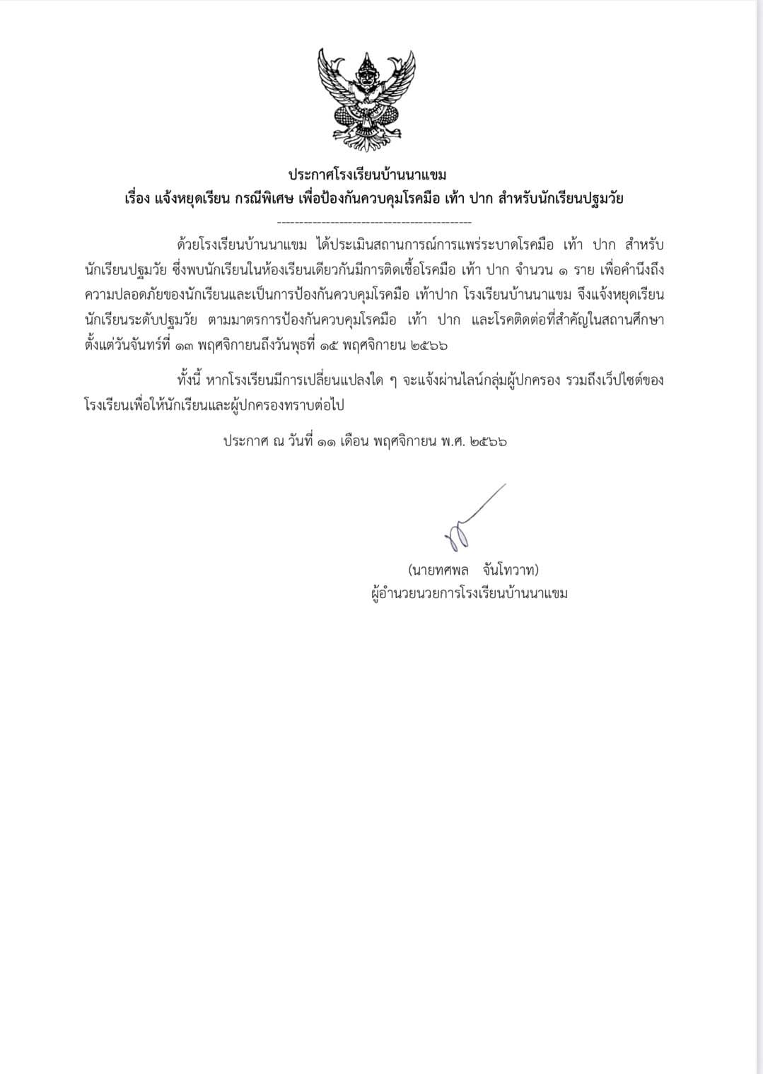 ประกาศโรงเรียนบ้านนาแขม แจ้งหยุดเรียน กรณีพิเศษ เพื่อป้องกันควบคุมโรคมือ เท้า ปาก สำหรับนักเรียนระดับปฐมวัย 11 พฤศจิกายน